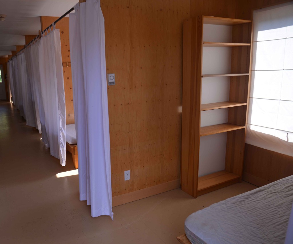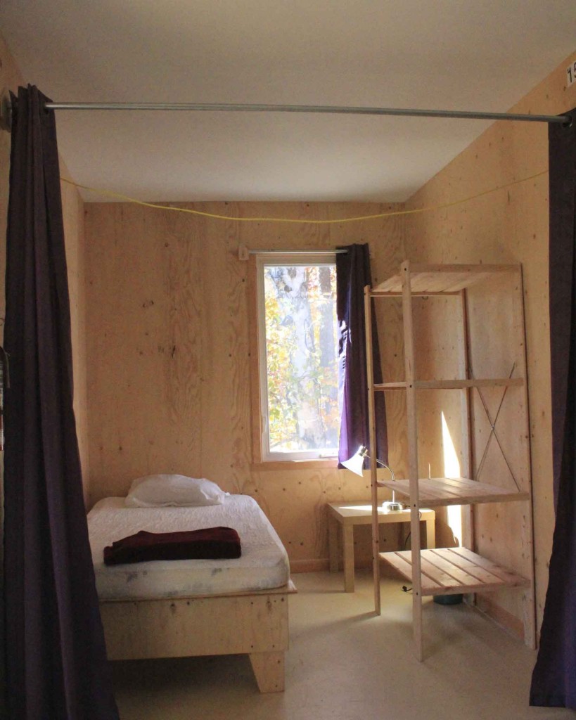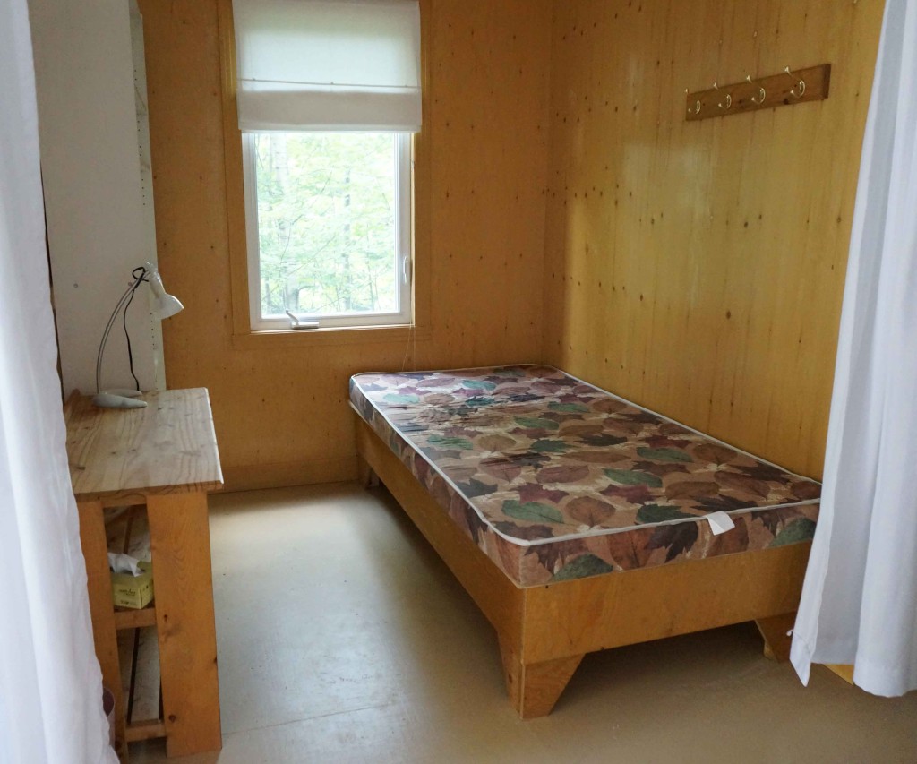 The dormitory accommodation provides simple individual sleeping areas on two floors of 14 beds each. A floor-to-ceiling partition separates each cubicle and a full-length curtain provides privacy from neighbouring guests. The dormitory is comfortable and close to nature. Showers and toilets are in the nearby bathhouses. The space has a bed with a single mattress and a pillow. Please bring your own bedding (bed sheets and pillow case) and towels.