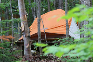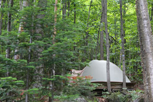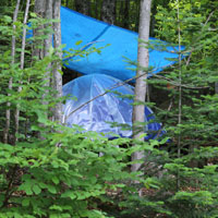 L’été, l’ashram offre des zones disponibles aux campeurs. Plusieurs yogis privilégient ce mode d’hébergement pour profiter au maximum du contact avec la nature environnante, en toute intimité. Vous pouvez d’ordinaire vous procurer des bâches pour les placer au-dessus de votre tente en cas de pluie (disponibles à la boutique de l’ashram). Vous devez apporter votre literie et vos serviettes. Tout près se trouvent un pavillon avec douches et toilettes.