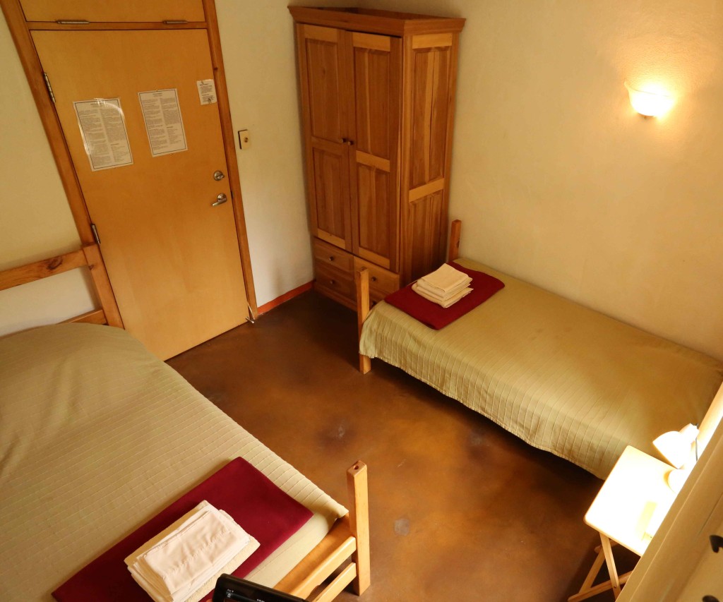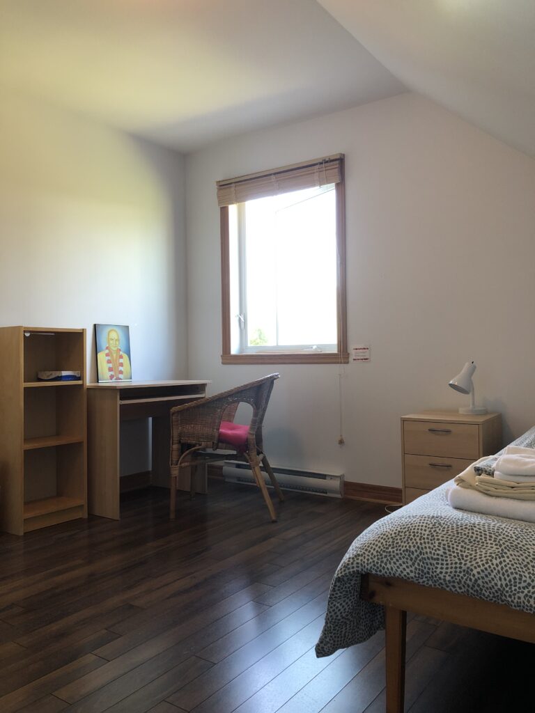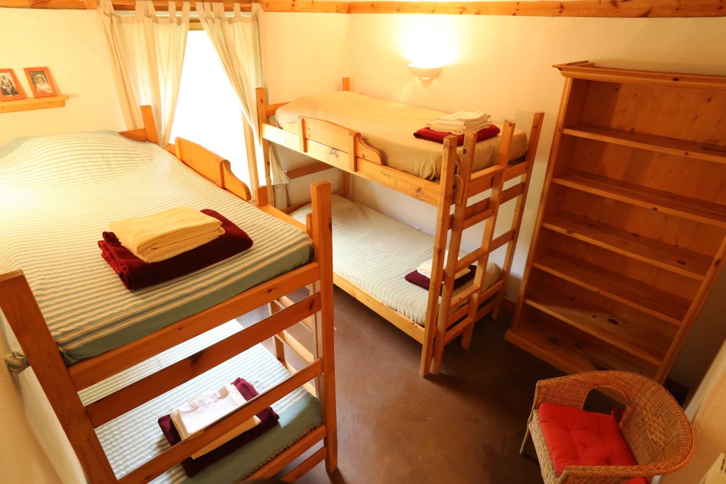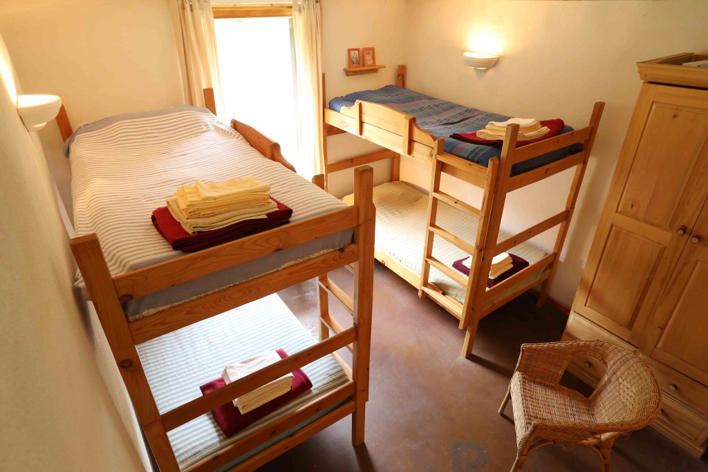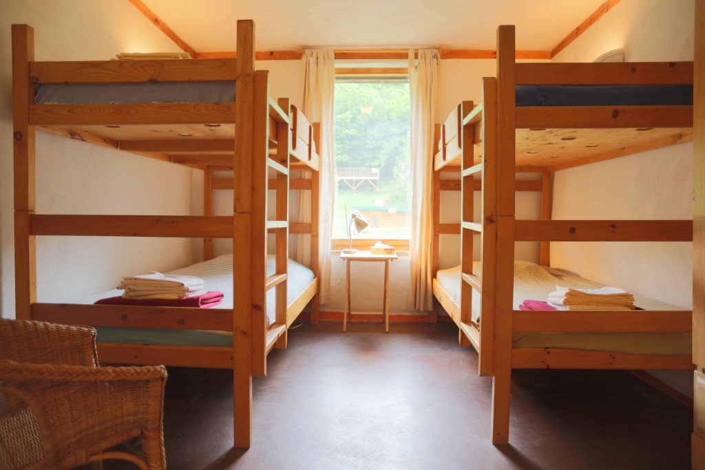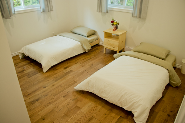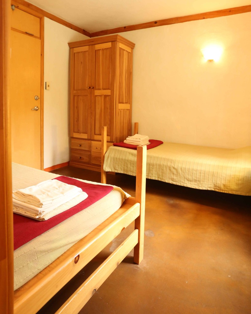 Dans une chambre partagée au lodge, il y a deux lits à deux étages, pour un total de 4 personnes du même sexe. Les chambres sont comfortables et accueillantes avec une armoire et une salle de bain privée. Réservations disponibles seulement pour un groupe de 2 personnes au minimum participant au même programme. Dans ce pavillon se trouvent aussi la réception, le sauna, la bibliothèque, la boutique et la salle à manger. Le bâtiment a été conçu dans le respect de l’écologie pour un confort optimal : murs de paille crépis, chauffage radiant au plancher, mezzanine ensoleillée, terrasses extérieures avec vue sur les jardins.