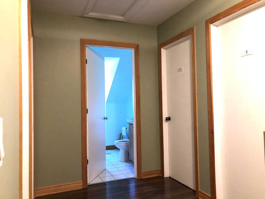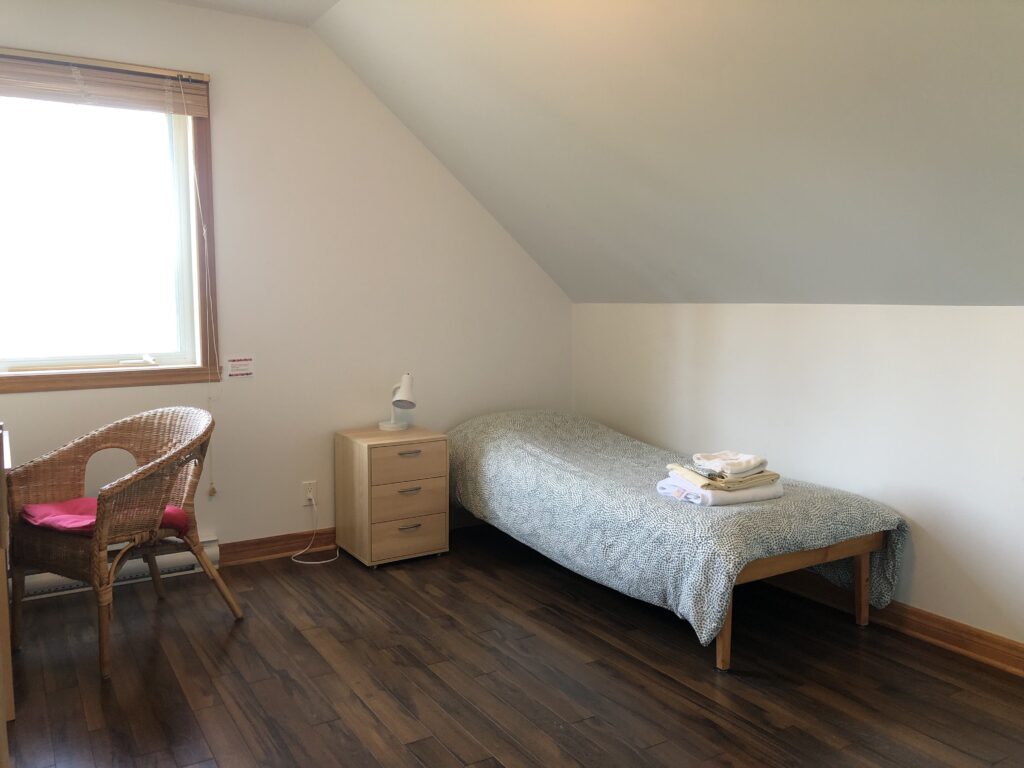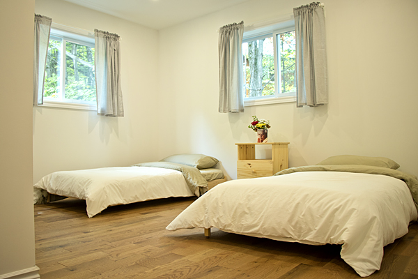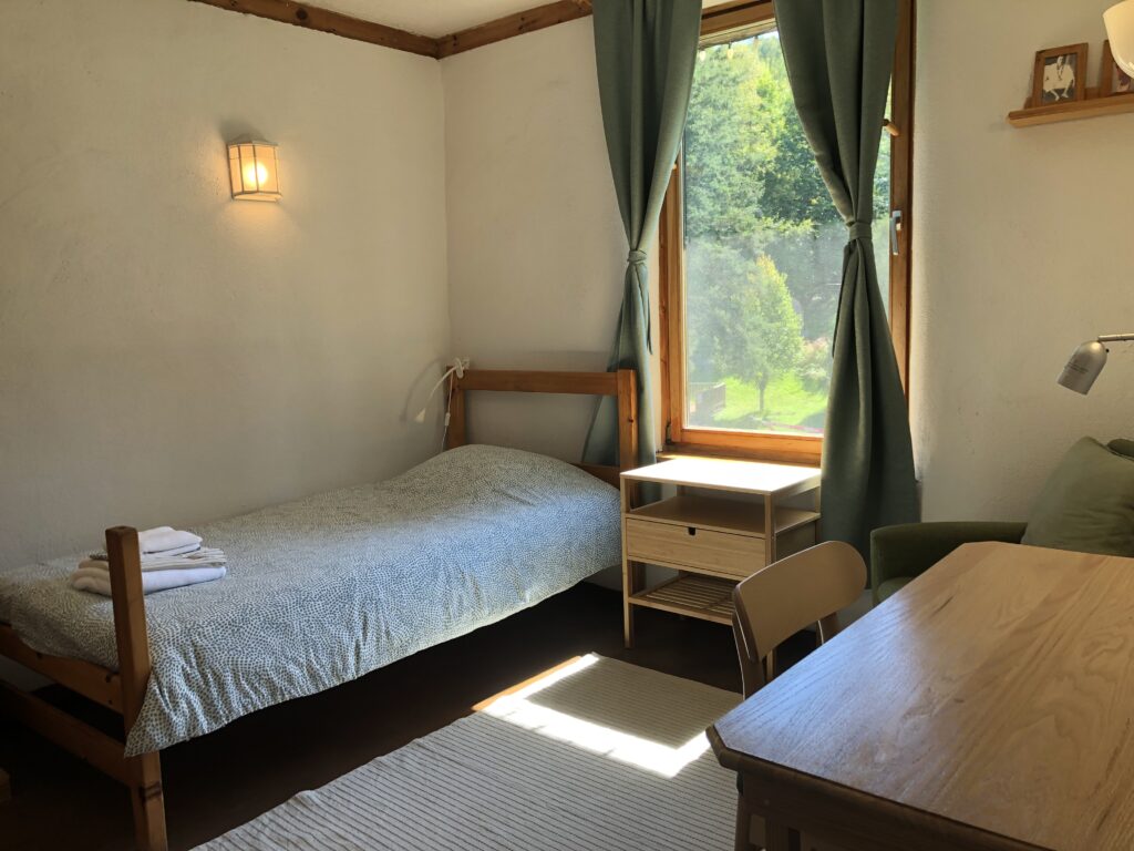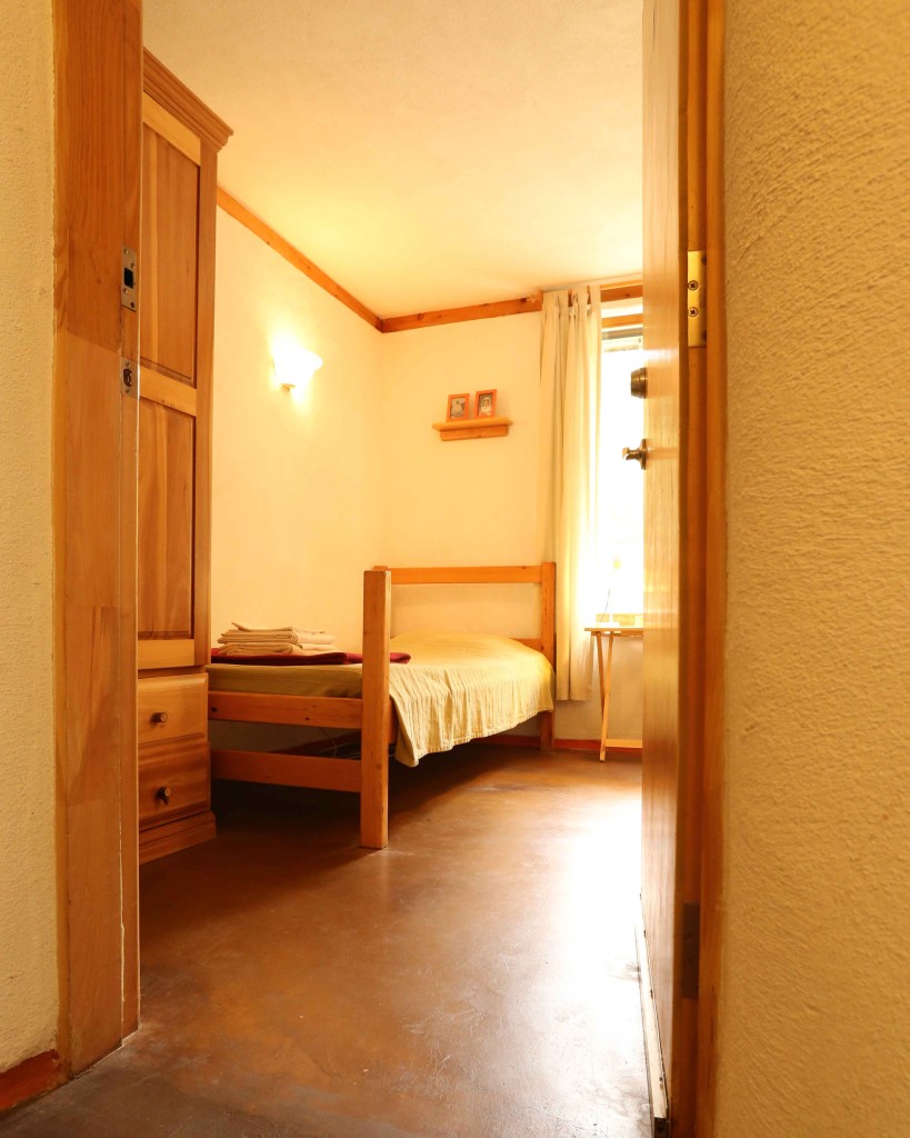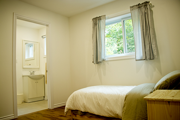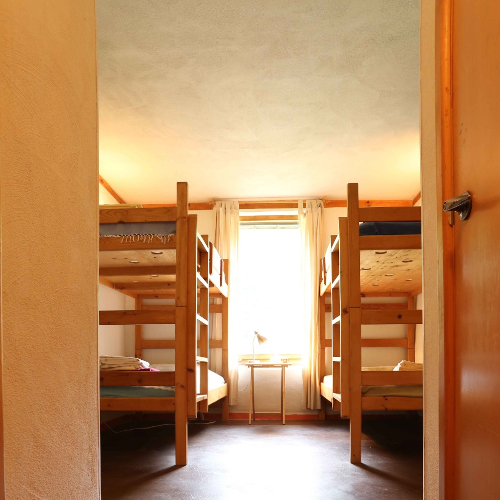 Dans une chambre partagée au lodge, il y a deux lits à deux étages, pour un total de 4 personnes du même sexe. Les chambres sont comfortables et accueillantes avec une armoire et une salle de bain privée. Réservations disponibles seulement pour un groupe de 2 personnes au minimum participant au même programme. Dans ce pavillon se trouvent aussi la réception, le sauna, la bibliothèque, la boutique et la salle à manger. Le bâtiment a été conçu dans le respect de l’écologie pour un confort optimal : murs de paille crépis, chauffage radiant au plancher, mezzanine ensoleillée, terrasses extérieures avec vue sur les jardins.