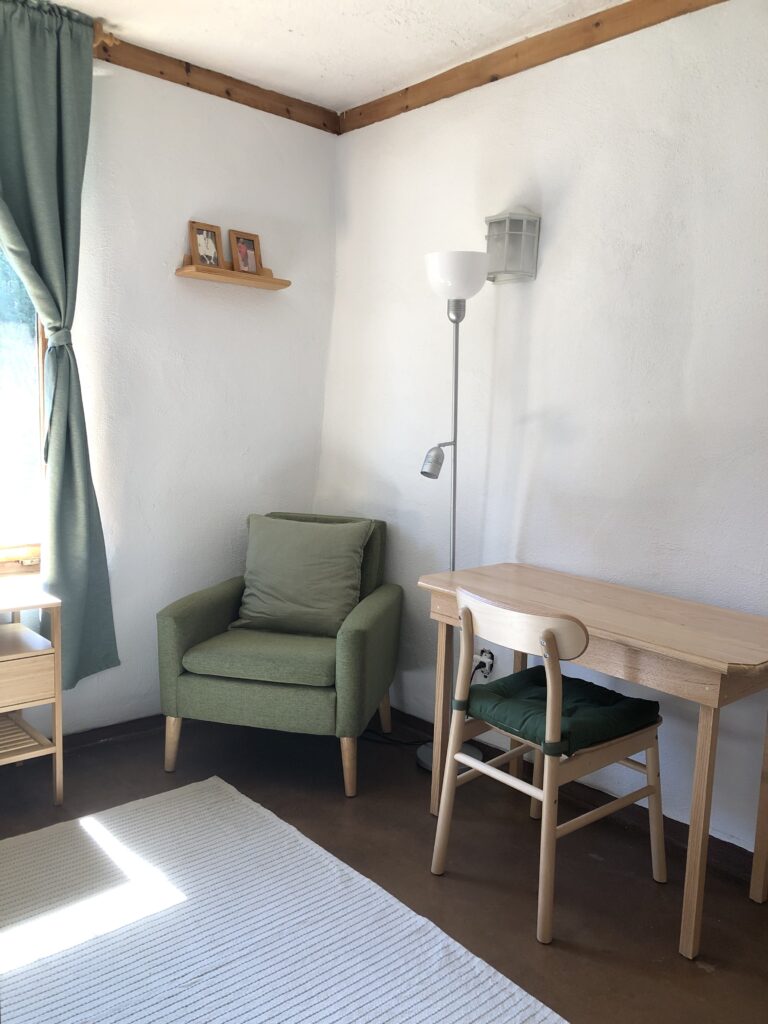 The Lodge is in the same building as the Reception, the sauna and the dining room. It is a comfortable ecological building made of straw bales. The underfloor heating system diffuses heat evenly throughout. The building has a comfortable seating area and roof terraces overlooking the gardens where guests can enjoy the outdoors when the weather permits. The double rooms in the Lodge are each shared by two people. Each room has two single beds, armoire and a private bathroom.